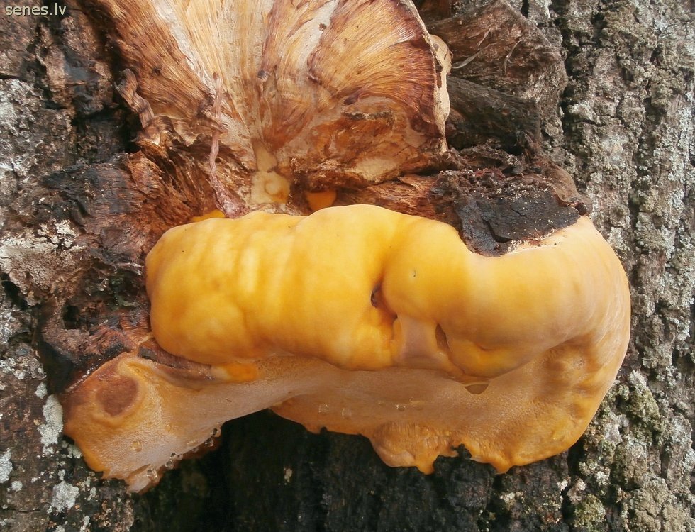 Košās zeltpores, kas sākušas augt paveca ozola stumbra plaisā (augstāk pa labi), skatītas tuvpānā.