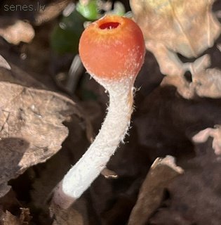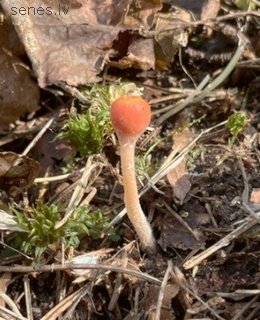 Maza askusēne ar salīdzinošii garu (1¼ lidz 4 cm) un samērā tievu (ap ¼ cm) kātiņu, augšdaļā bāli rozā vai gaiši dzeltenīgu, apakšdaļā tumšāku; ar mazu (½ līdz 1 cm diametrā) koši sarkanu, sākumā lodveida, tikai virsotnē vaļēju galviņu, vēlāk plaši atpletušos un zvaigžņveidā saplaisājušu (platumā pat līdz 2½ cm); ar cietu, taču elastīgu bālganu mīkstumu. Aug jau no ziemas vidus līdz pat pavasara beigām no melniem, iegareniem sklerocijiem, kas pieauguši augsnē sekli slēptai lapkoku koksnei. Ārkārtigi reti sastopama: zināmi 2 atradumi. Jautājumam par ēdamību nav jēgas. |