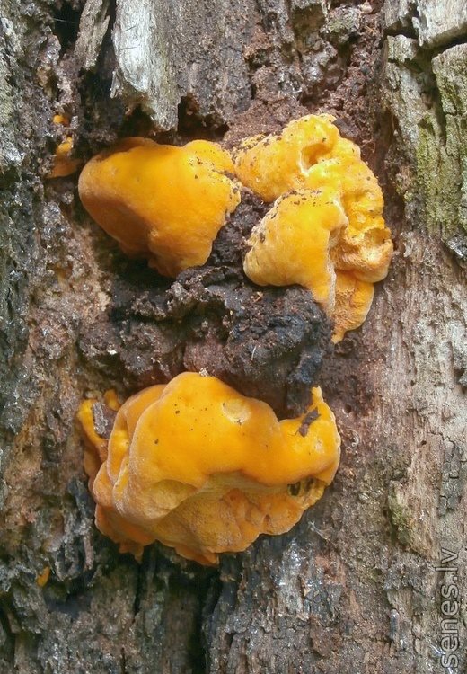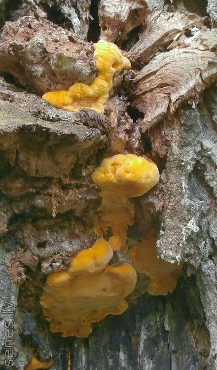 Košās zeltpores, kas sākušas augt paveca ozola stumbra plaisā (kopskats augstāk pa labi), skatītas tuvpānā.