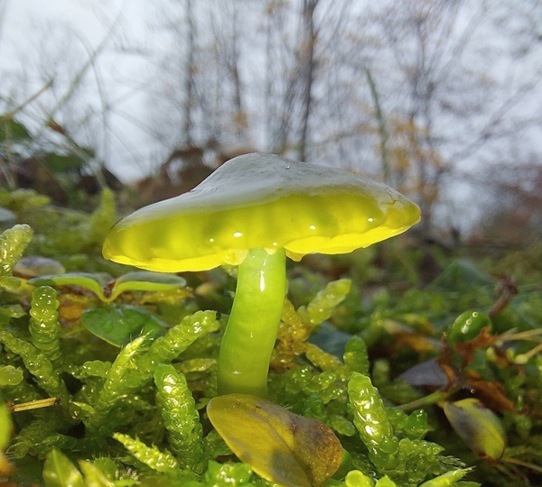 Šīs lappuses materiālus ir atļauts pārpublicēt, norādot avotu - Latvijas Mikologu biedrību (foto - arī to autorus), Zaļā krāsa ir mežs, auglība un dzīvība. Zaļa ir arī 2025. gada sēne zaļā jeb papagaiļu stiklene Gliophorus psittacinus (Hygrocybe psittacina) izskatīga, krāšņa un unikāla! Latvijas Mikologu biedrība izvēlējusies aizsargājamo zaļo stikleni, lai pievērstu tai sabiedrības uzmanību, izceltu bioloģiskās daudzveidības un biotopu aizsardzības nozīmi. Zaļā (papagaiļu) stiklene ir maza, krāšņa sēne, kuru grūti sajaukt ar citu tās koši zaļā cepurīte un kātiņš ir īsts dabas brīnums. Šī sēne aug nabadzīgās augsnēs, īpaši zālājos un parkos. Tā nav indīga, bet nav arī ēdama sīkā izmēra dēļ. Latvijā pirmo reizi pamanīta 1951. gadā Lielplatones apkārtnē, bet uz Latvijas Nacionālā dabas muzeja krājumu pirmais eksemplārs atceļojis no Moricsalas 2012. gadā. Jauna sēne ir zaļa, ar spīdīgu, gļotainu cepurīti; tās krāsa drīz kļūst dzeltenāka, izņemot kātiņa augšgalu, kurš pie cepurītes vienmēr saglabājas zaļgans. Cepurītes diametrs ir no 1 cm līdz 3,5 cm, kātiņa garums 27 cm. Lapiņas pelēkbaltas līdz dzeltenas, ar nedaudz zaļu krāsojumu, biezas un retas. Bieži novērojamas starplapiņas, kas kā mazas dzīsliņas šķērso lapiņu apakšējo daļu. Sēnei raksturīga maiga sēņu smarža un baltas sporas. Meklē zaļo stikleni vasarā un rudenī, līdz pat salnām. Sēnes iecienīta dzīvotne ir nabadzīgas augsnes neuzlaboti vai ilgstoši nemēsloti zālāji (skāba vai neitrāla pH reakcija) ceļmalas, laukmalas un ganības, parki, kapi un baznīcu pagalmi, tomēr tās sastopamas arī mežos. Aug gan pa vienai, gan lielākās grupās desmitiem augļķermeņu vienuviet. Pasaulē izplatīta suga, bet Latvijā ļoti reti sastopama: līdz 2024. gadam ir zināms vien nepilns desmits atradņu. Sēne iekļauta topošajā Latvijas Sarkanajā grāmatā. Atrodot labāk atstāt sēni netraucēti augam, tomēr sugas saglabāšanai daudz būtiskāk ir saglabāt tās augšanai piemērotus biotopus. Ja ieraugi zaļo stikleni dabā pastāsti par to mums! Raksti uz mikologu.biedriba@inbox.lv un atzīmē savu atradumu portālā www.dabasdati.lv. Tava ziņa palīdzēs veicināt sēņu pētījumus Latvijā! Plašāka informācija: Inita Dāniele (e-pasts mikologu.biedriba@inbox.lv, tel. 25932199). Fotoilustrācijas (7 gab.)