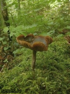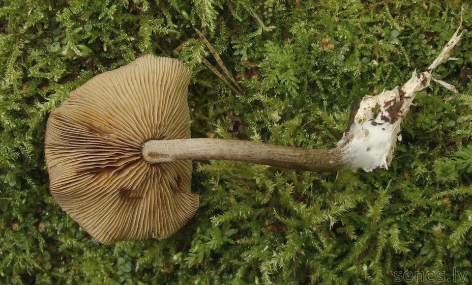 lapiņsēne ar samtainu, sausumā olīvpelēku un mitrumā tumši sarkanbrūnu (vidū gandrīz melnu) cepurīti,