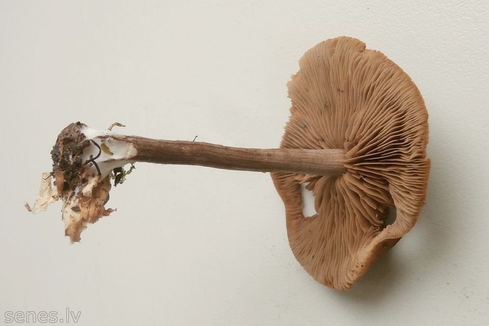 ar olīvdzeltenu apsarmes klātu šķiedrainu kātiņu, kam pie pamata ir balts micēlijs; ar mikstumu,