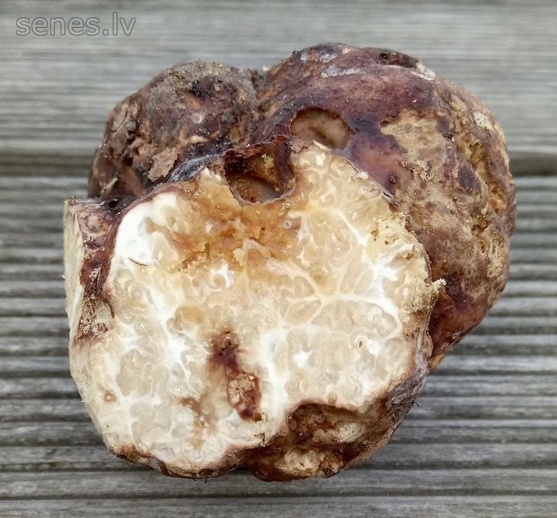 Bumbuļveidīga, diezgan neregulāras formas askusēne ar caurmēru 4-10 cm (paretam līdz 15 cm) un tipiskāko svaru 50-300 g (reti līdz 500 g), kura aug pazemē līdz 10 cm dziļumā, taču vecumā nereti izspraucas pa daļai virszemē. Jaunai sēnei virsmiziņa ir bālgana un gluda, vēlāk kļūst brūngana, kā arī krunkojas un plaisā. Augļķermeņa iekšiene sākumā gandrīz balta ar pelēcīgu dzīslojumu, kurš griezumā veido marmoram līdzīgu faktūru, un tikpat kā bez smaržas. Ar laiku iekšienes pamatmasa un dzīslojums attiecīgi dzeltē un brūnē, bet aromāts kļūst arvien stiprāks un visai specifisks. Aug rudens pusē (Latvijā līdz šim ir atrasta jūlijā un augustā) gan lapkoku, gan skujkoku mežos pa vienai vai arī mazās grupās. Par sastopamības biežumu Latvijā nav īsti skaidrs: novērota vairākviet Rēzeknes novadā (turklāt ievērojamā skaitā) un kaimiņos, kā arī dažviet Aizputes novadā; turpretī citur mūsu zemē līdz šim (2022) nav manīta. Ēdama, taču skaitās daudz mazāk vērtīga nekā īstās trifeles (Tuber sp.). |