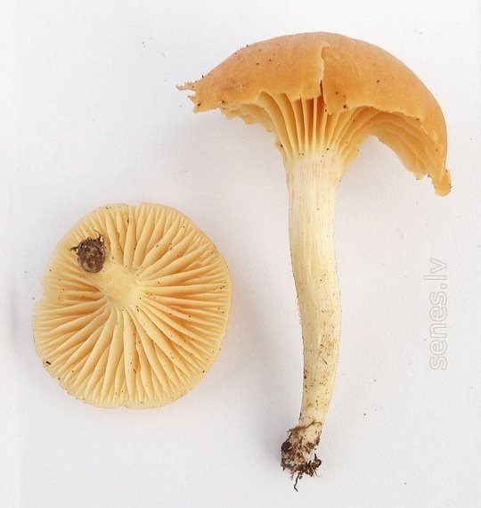 lapiņsēne ar gludu un kailu, sākuma oranžbrūnu vai aprikožkrāsas, bet vecumā gaiši dzeltensārtu vai gaišas okerkrāsas cepurīti;