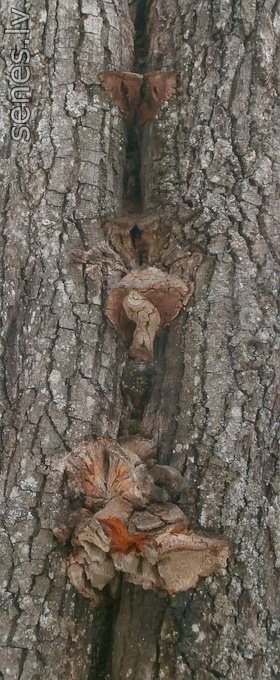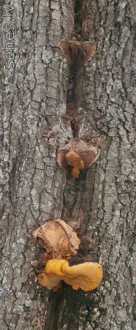 Košās zeltpores labprāt aug stumbra plaisā (šeit: augļķermeņu grupa 10. augustā). |