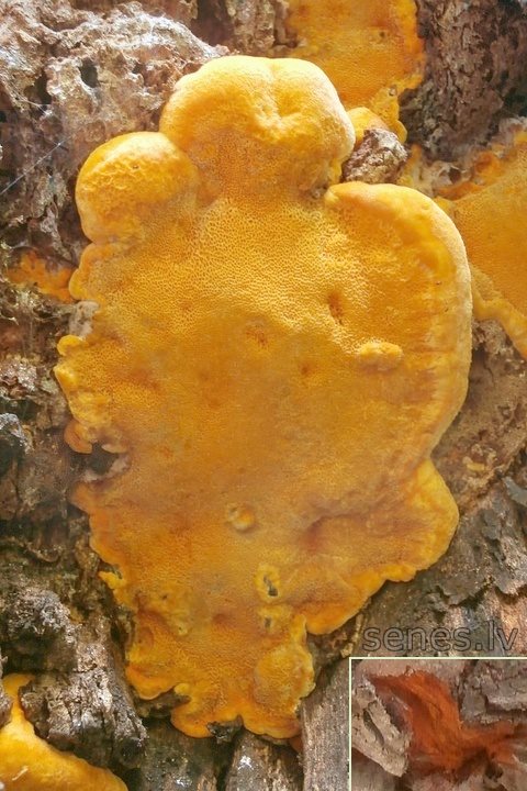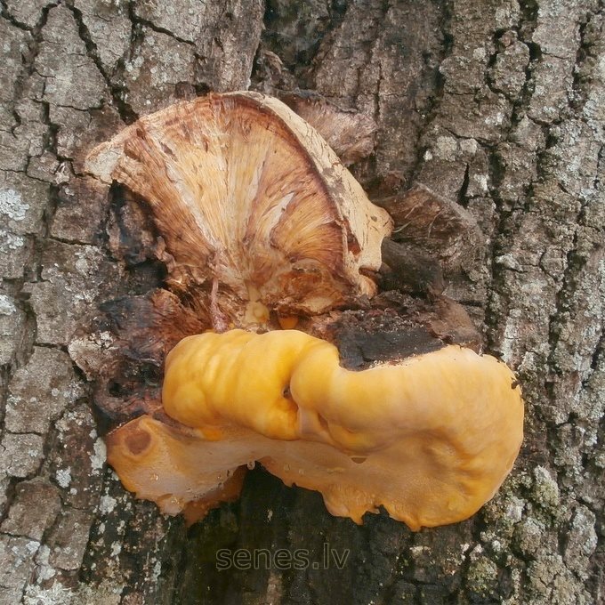 Pa kreisi - košās zeltpores uz bojā ejošas liepas (Siguldas pašā centrā!). Augšā - augļķermeņi, kuri pa kreisi šķiet iepretī ēkas 3.stāvam, tuvplānā. Piederību sugai noteica šo atradni pamanījušais (2020.g.) Ivars Leimanis. |