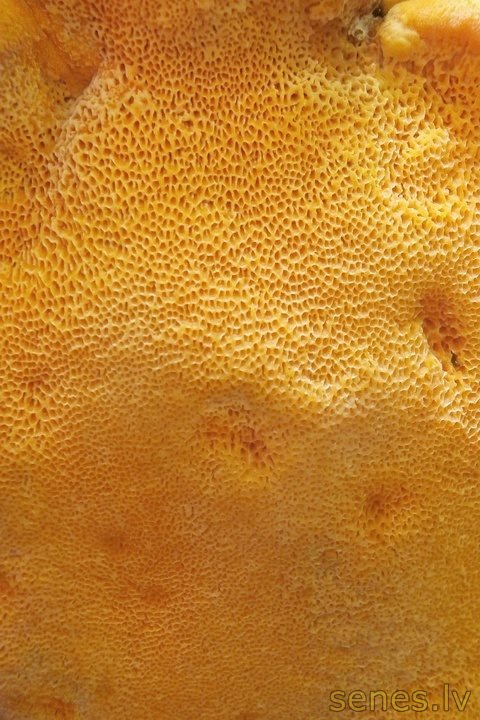 Kamēr vēl svaiga, košā zeltpore savu dzeltenoranžo krāsojumu saglabā gan augšpusē, gan apakšpusē, taču augļķermeņa mala ar laiku kļūst asa. (Šeit: eksemplārs, kas izaudzis nevis uz ozola, bet uz liepas!) |