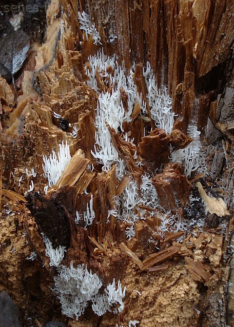 (un pretstatā korallenēm), aug uz koksnes (šeit - uz pussairuša celma).
