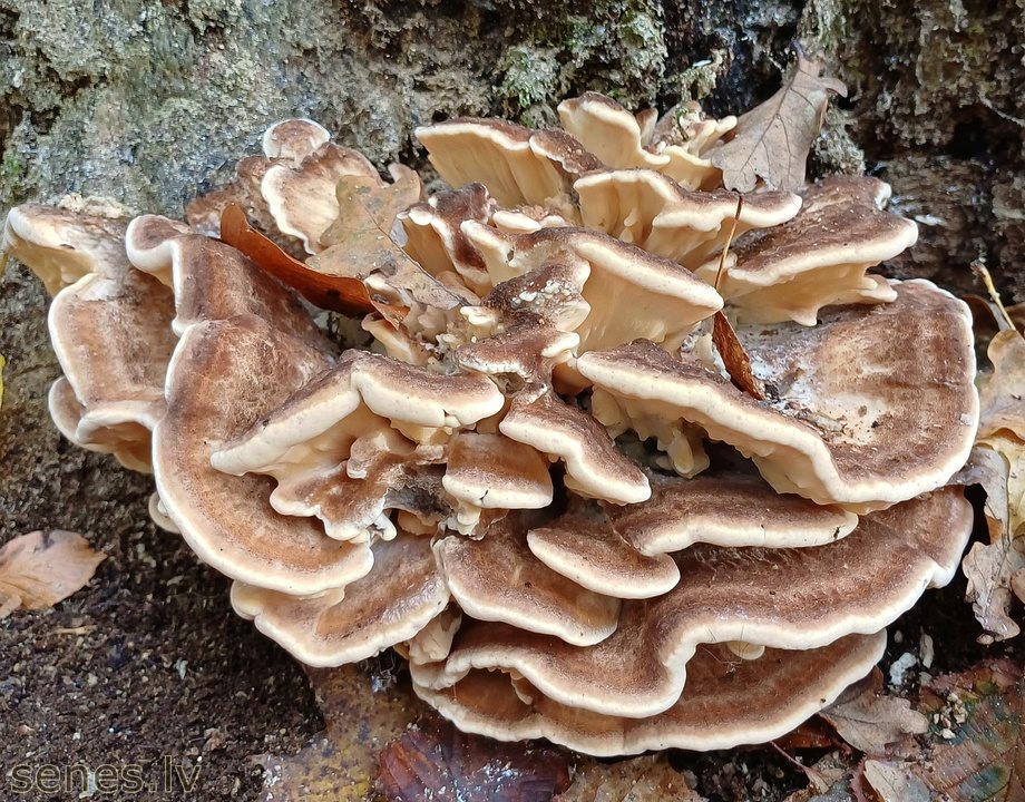 Īsmūžiga čemurveida piepe, kam augļķermenis sastāv no daudzām mēlesveidīgām pagaiši brūnu toņu cepurītēm, kuru kātiņiem ir kopīga pamatne. Katra cepurīte parasti ir 10-30 cm plata un 1-3 cm bieza; visa čemura platums tipiski ir ½-¾ m robežās, bet reizēm pat pārsniedz veselu metru (skaitļi raksturo sugu kopumā; pie mums līdz šim novēroti stipri mazāki). Poras cepurīšu apakšpusē ir mazas un baltas, taču ievainojumos melnē. Aug rudenī pie ozolu un dižskābaržu, paretam vēl vairāku citu lapkoku un pat dažu skujkoku pamatnēm, arī uz seklām saknēm patālu no stumbra. Latvijā ārkārtīgi reti sastopama: zināms viens vienīgs pietiekami ticams atradums (2024). Pamatojoties uz XX gs. novērojumiem, kuri mūsdienās atzīti par visai nepārliecinošiem vai pat kļūdainiem, ierakstīta Sarkanajā grāmatā (3. kat.), tomēr vēlāk Aizsargājamo sugu sarakstā nav iekļauta. |