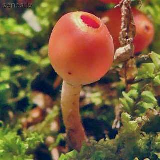Maza askusēne ar salīdzinošii garu (1¼ lidz 4 cm) un samērā tievu (ap ¼ cm) kātiņu, augšdaļā bāli rozā vai gaiši dzeltenīgu, apakšdaļā tumšāku; ar mazu (½ līdz 1 cm diametrā) koši sarkanu, sākumā lodveida, tikai virsotnē vaļēju galviņu, vēlāk plaši atpletušos un zvaigžņveidā saplaisājušu (platumā pat līdz 2½ cm); ar cietu, taču elastīgu bālganu mīkstumu. Aug jau no ziemas vidus līdz pat pavasara beigām no melniem, iegareniem sklerocijiem, kas pieauguši augsnē sekli slēptai lapkoku koksnei. Ārkārtigi reti sastopama: zināmi 2 atradumi. Jautājumam par ēdamību nav jēgas. |