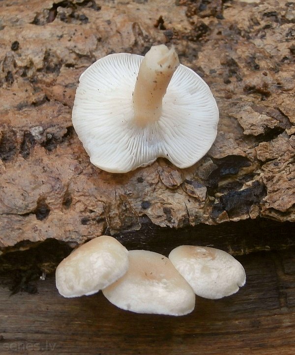 Neliela lapiņsēne (diametrs 2-10 cm) ar sākumā netīri bālganu, vēlāk pelēcīgi brūnu, turklāt miltainas apsarmes klātu cepurīti, vidū viegli iedobtu; ar baltām, vecumā reizēm dzeltējošām lapiņām, kuras ir visai cieši viena pie otras; ar paīsu vispirms baltu, vēlāk viegli brūnējošu pūkanu kātiņu, nedaudz asimetriski novietotu; ar sīkstu baltu mīkstumu, kurš griezumā krāsu nemaina un smaržo pēc miltiem vai augļiem. Aug rudens pusā uz trupošas koksnes (nevis uz zemes kā citas piltuvenes!), lielākoties uz ošu kritalām. Skaitījusies ļoti reta, ir iekļauta Aizsargājamo sugu sarakstā. Taču mūslaikos novērota arvien biežāk, sevisķī dažos gados, ko, iespējams, izraisa slimības dēļ kritušu gobu daudzuma palielināšanās. Neēdama. Tā kā pēc vair. būtiskām īpašībām atšķiras no pārējām piltuvenēm (Clitocybe), jau pasen ir pārcelta uz citu ģinti (Ossicaulis), tomēr latviski joprojām saucas piltuvene. |