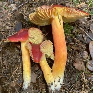Gaileņu stiklene Hygrocybe cantharellus Ar sarkanu kātiņu un gailenei līdzīgu cepurīti. Pareta. |