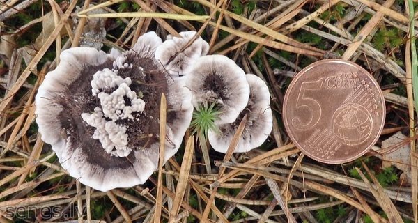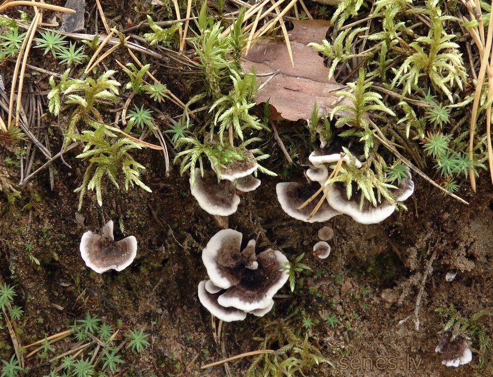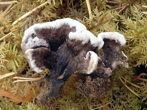 Maza vai neliela (dazi cm) sīkstas konsistences sēne, kurai augļķermeņa apakšpusi klāj nokarenas, sākumā bālganas, taču ar laiku tumsnējošas (pelēkbrūnganas) adatiņas ("zobi"), bet virspuse ir samtaina un gaišāk vai tumšāk brūnpelēka, izņemot balto malu. Aug dažāda sastāva mežos, tikpat kā vienmēr grupās, nereti saplūstot pa vairākām kopā. Ļoti reti sastopama. Neēdama sīkstās konsistences un nebaudāmās garšas dēļ. |
