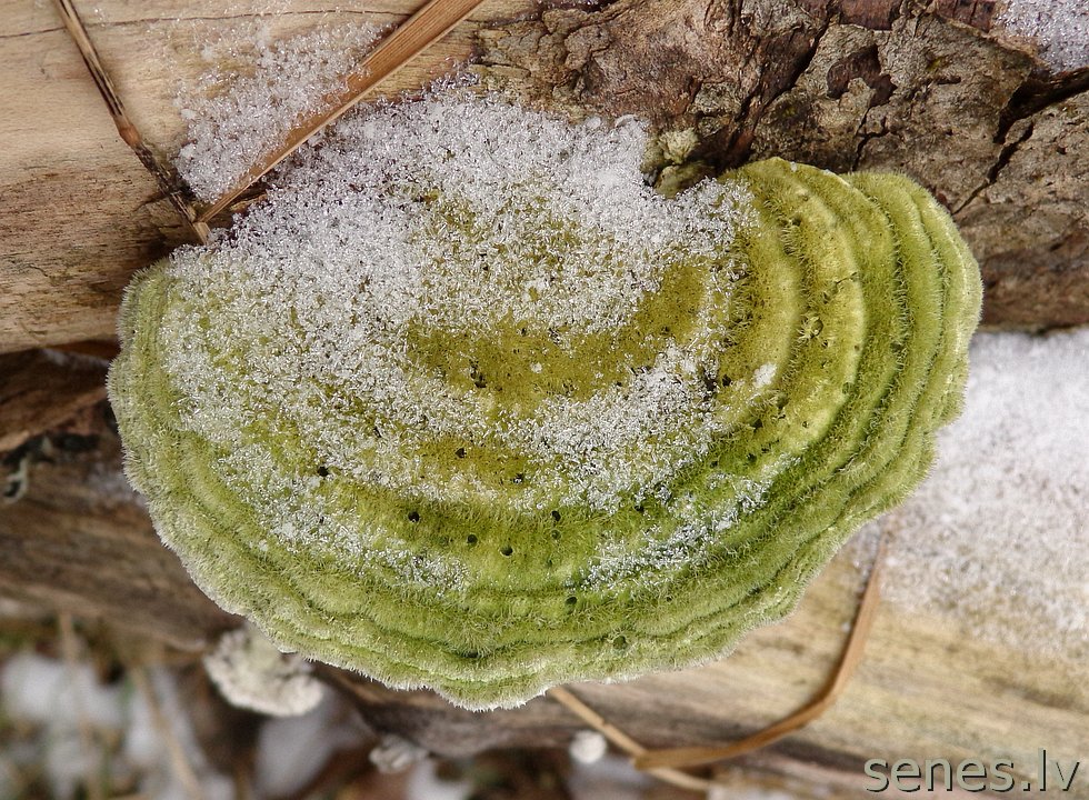 Kāda no tauriņpiepēm (noskaidrot, kura īsti suga, noslinkojām - vien papriecājāmies par skaistumu), ar zaļām aļģēm apaugusi un sniega apbārstīta. |
